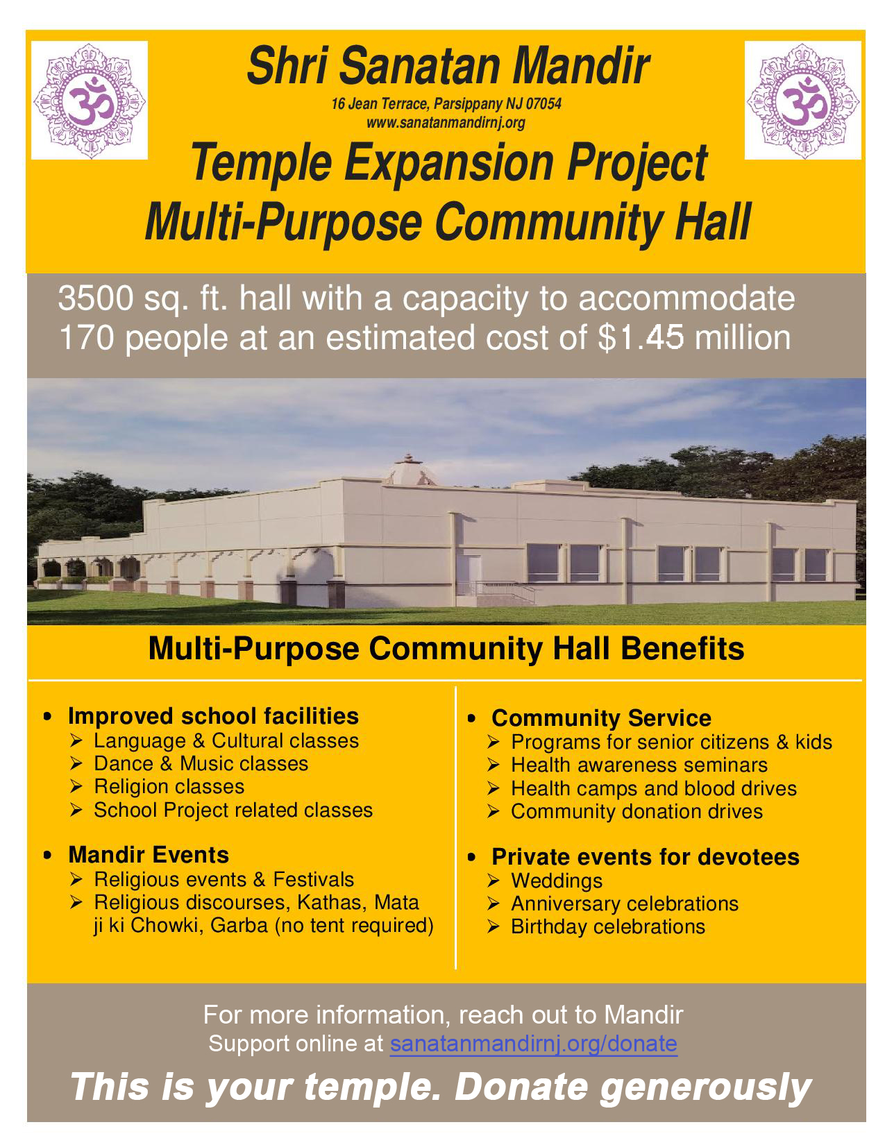 As our Mandir continues to grow, your support is especially meaningful. Donations also contribute toward our Temple Expansion Project, which will create a 3,500 sq. ft. multipurpose community hall at a cost of over $1.45M. This new space will accommodate larger temple events, provide improved facilities including additional space for classrooms for Sunday School, and serve as a venue for diverse cultural and community gatherings thereby strengthening our shared commitment to faith, education, and togetherness.